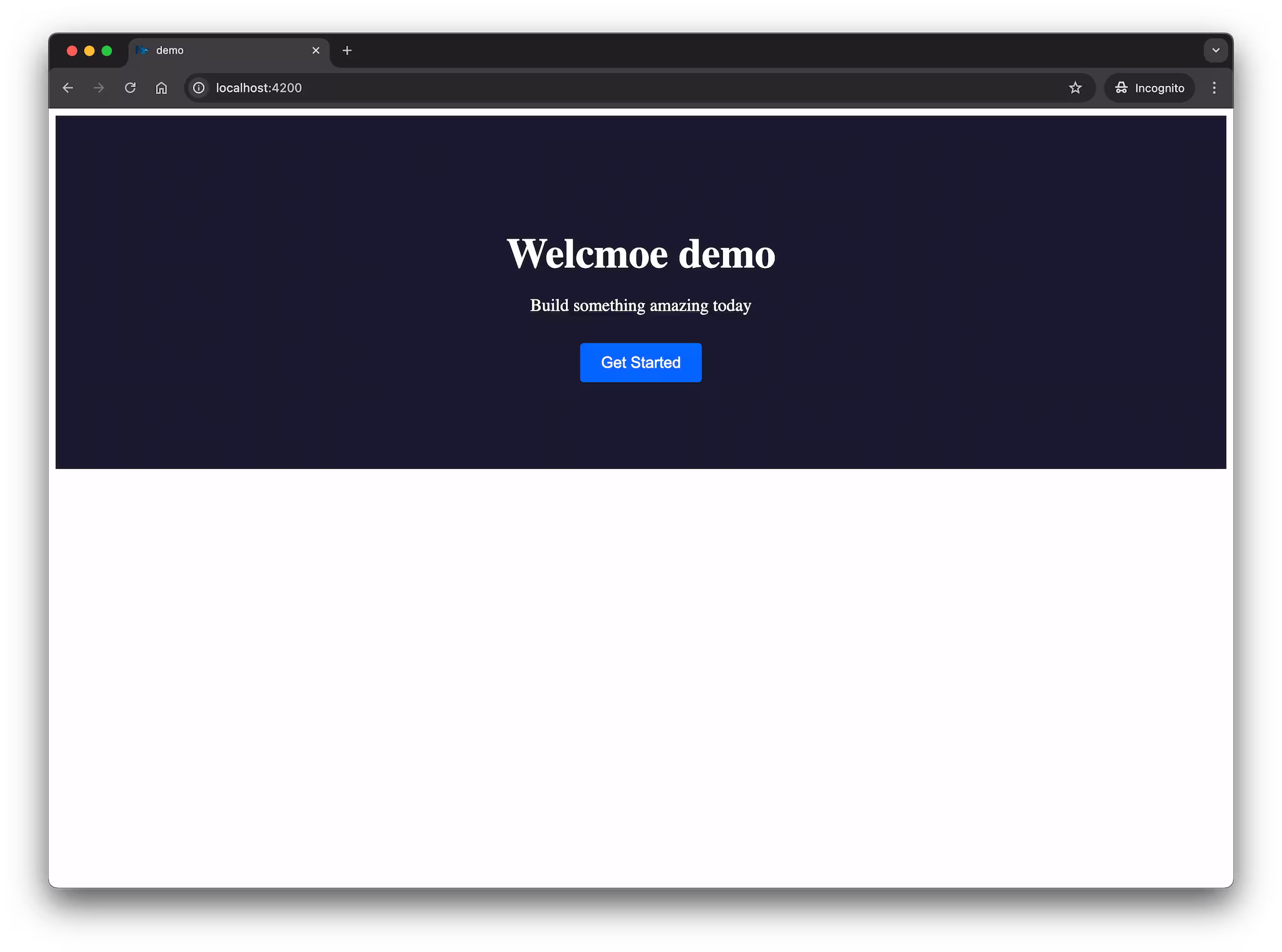 1import { Component } from '@angular/core'; 2import { RouterOutlet } from '@angular/router'; 3// importing the component from the library 4import { Hero } from '@acme/ui'; 5 6@Component({ 7 selector: 'app-root', 8 standalone: true, 9 imports: [RouterOutlet, Hero], 10 template: ` 11 <lib-hero 12 title="Welcmoe demo" 13 subtitle="Build something amazing today" 14 cta="Get Started" 15 ></lib-hero> 16 `, 17}) 18export class App {} 19